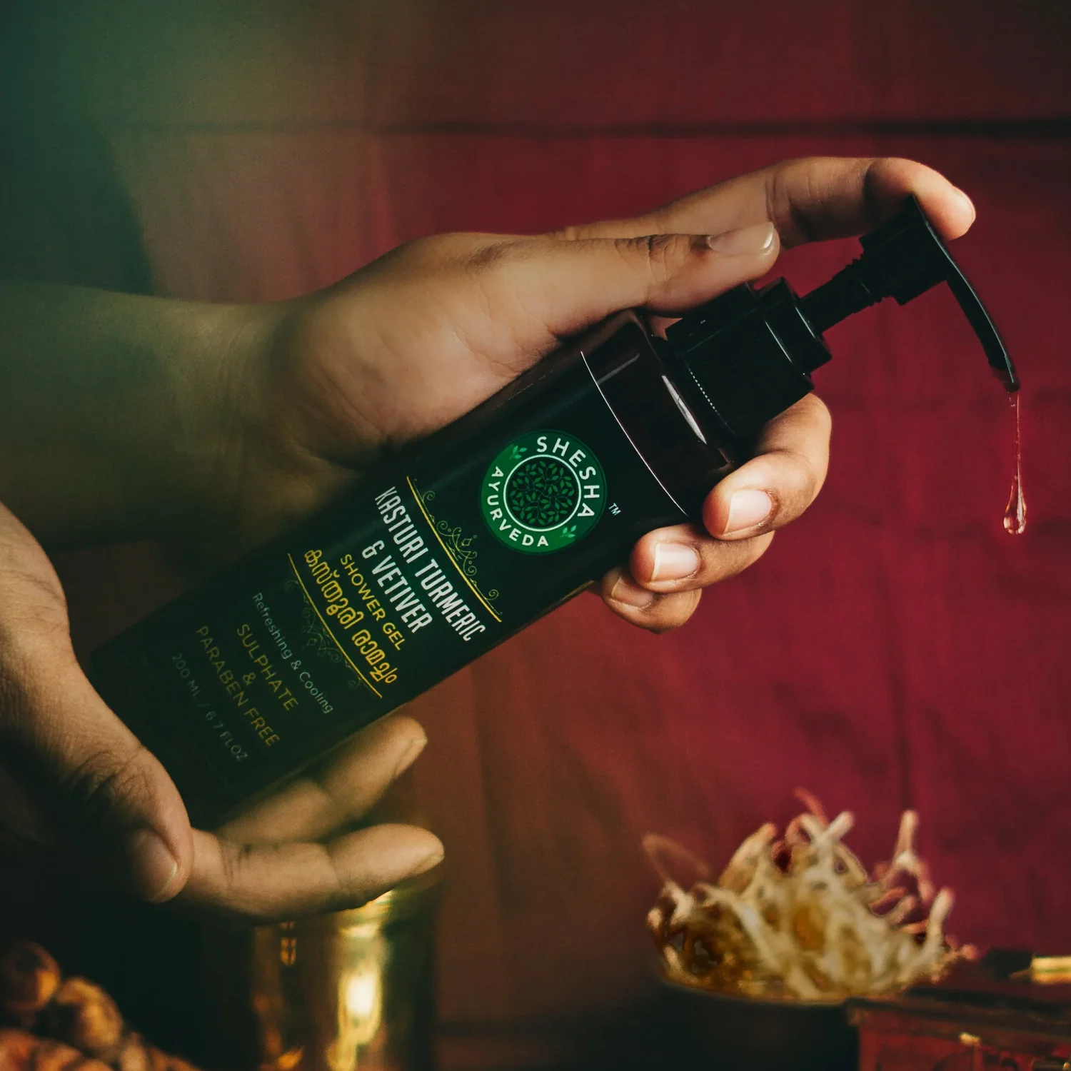 Transform your daily shower into a spa-like ritual with Shesha Ayurveda's Kasturi Turmeric & Vetiver Shower Gel. This premium sulfate and paraben-free formula combines the hydrating essence of vetiver with the powerful skin-brightening benefits of three types of Kasturi Turmeric and cooling aloe vera for a truly luxurious bathing experience that cleanses, brightens, and nourishes your skin.